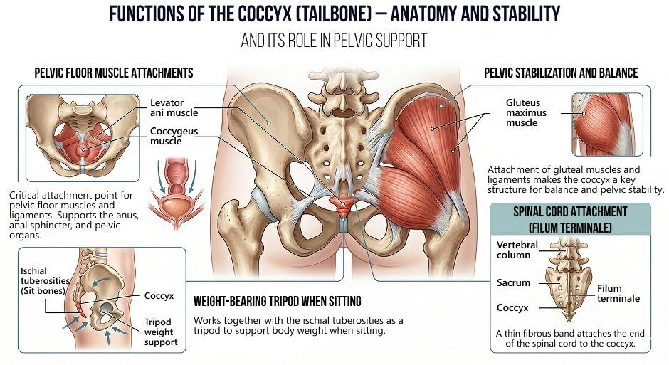 The coccyx (aka tailbone) serves as a critical attachment point for your pelvic floor muscles and ligaments, providing an anchor that supports the anus, anal sphincter, and pelvic organs. Its connections to the gluteus maximus and levator ani muscles make the coccyx a key structure for balance and pelvic stability. It also works together with the sit bones, acting as a weight-bearing tripod that supports the body when sitting. A fibrous band called the filum terminale attaches the spinal cord to the coccyx.