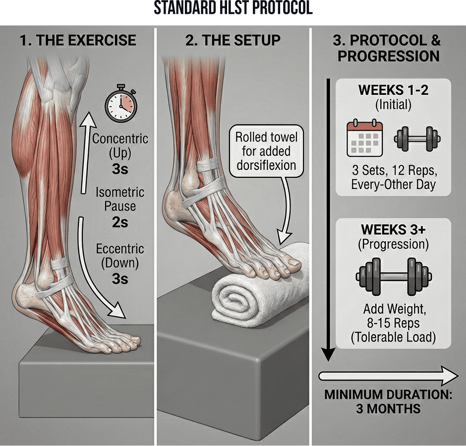 HLST has been shown to stimulate collagen synthesis, improve tissue remodeling, and enhance the plantar fascia’s ability to handle tensile stress. This protocol has also been proven effective for Achilles and patellar tendinopathies.