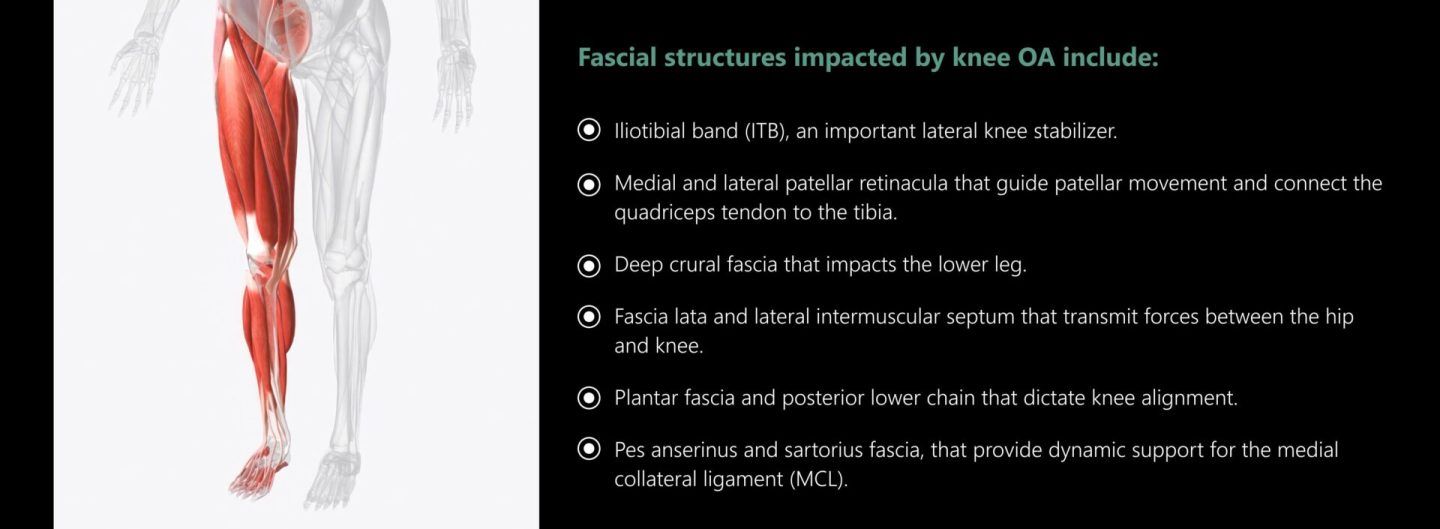 Until recently, fascia was largely ignored in knee OA research, but new discoveries in the 2020s show that fascial structures play critical roles in knee pain, stiffness, biomechanics, and knee OA progression. The relationship between fascia and knee OA is a 2-way street – knee OA impacts fascia, making it denser and more fibrous, and reducing its gliding properties, while fascial restrictions can impact knee mechanics.