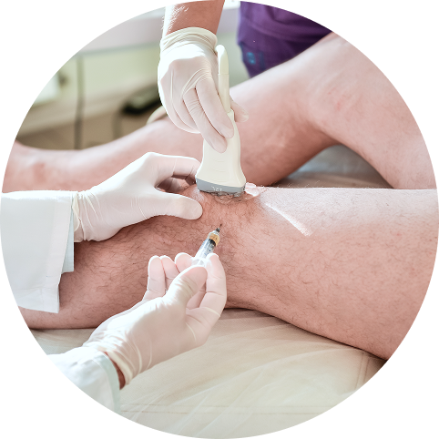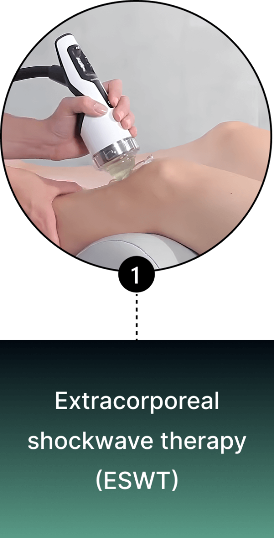 Extracorporeal shockwave therapy (ESWT) is a noninvasive treatment that uses high-energy acoustic waves to induce biological and physiological effects. ESWT reduces pain and inflammation, helps to realign and repair collagen fibers, promotes rehydration of synovial fluid and fascial tissues, and restores friction-free knee mechanics. ESWT is most effective when guided by high-resolution ultrasound imaging.