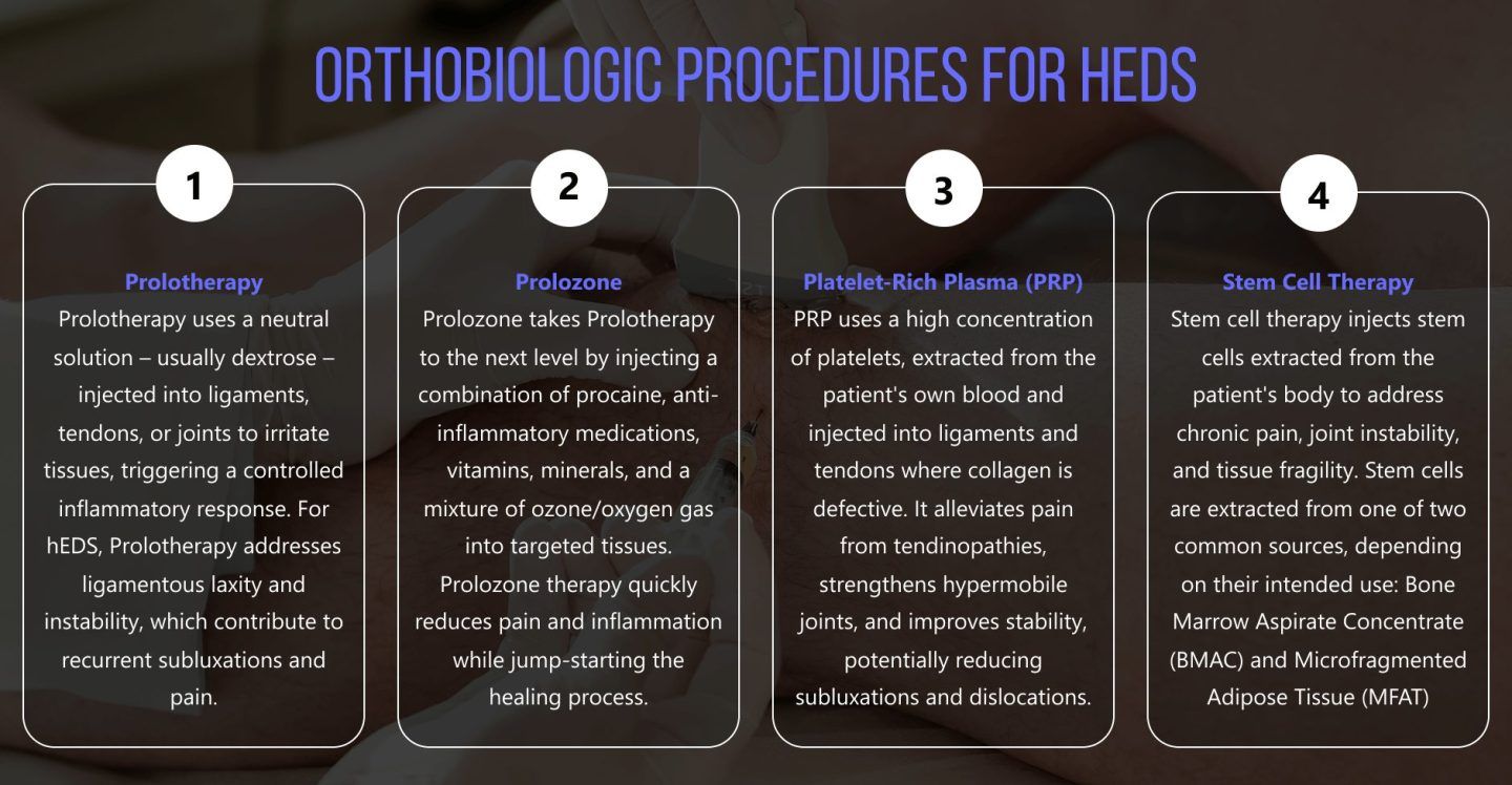 Hypermobile Ehlers-Danlos syndrome involves defective connective tissues, leading to joint hypermobility, chronic pain, instability, and tissue fragility. Regenerative therapies and orthobiologics target hEDS symptoms such as joint laxity, tendinopathies, and chronic pain, helping patients to avoid invasive surgery, which can be disastrous for hEDS sufferers.
