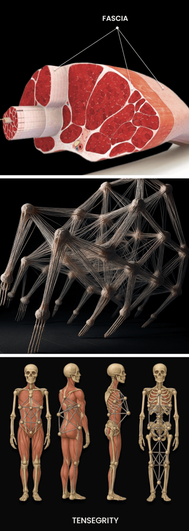 Fascia and muscles work synergistically to support the skeleton, hold organs and structures in place, guide and control movement, and distribute internal and external forces via elastic tension – aka biotensegrity. As long as myofascial tissues maintain their functional properties, biomechanics are optimized for mobility, stability and physical performance.