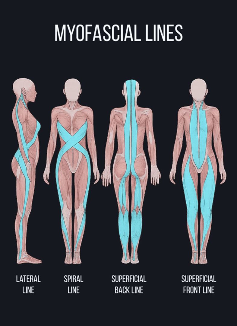 Muscles and nerves do not act alone. Muscle actions are controlled and guided with the help of fascia, a complex web of thin, tough connective tissue that surrounds and connects muscles, engulfs the visceral organs, and holds the body’s structures in place during dynamic movement. Fascia is strong and elastic, able to stretch and contract as the body moves, providing elastic tension that complements muscle action.